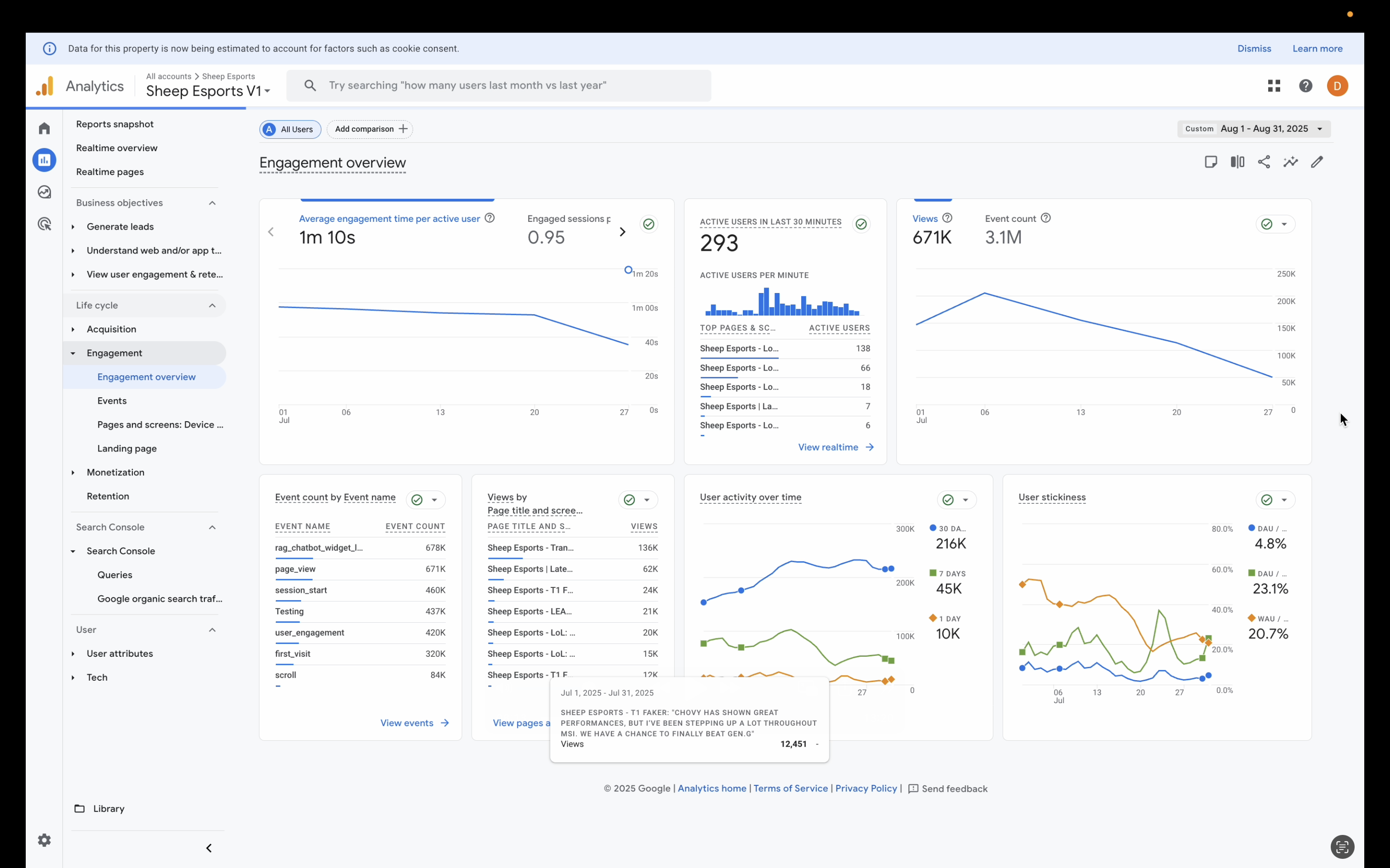 SheepEsports achieved remarkable growth, reaching over 600,000 monthly active users with an average engagement time of 1 minute 10 seconds per session. The platform consistently maintains 671K views and 3.1M events monthly, demonstrating strong user engagement. Analytics show excellent user retention with 293 active users in the last 30 minutes and high user stickiness rates, proving the platform's value to the esports community.
